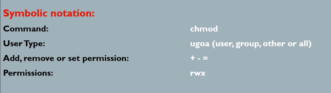 permission 을 수정하는 방법에는 symbolic notation 과 octal notation 두가지 방법이 있습니다.