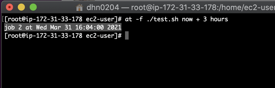 이전과 달리 첫번째 줄에 at 명령어와 함께 해당 작업이 수행될 시간을 입력한 뒤