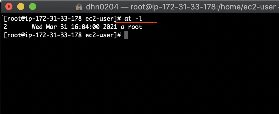 삭제 후에는 더이상 at job 목록에 나오지 않는 것을 확인할 수 있습니다.