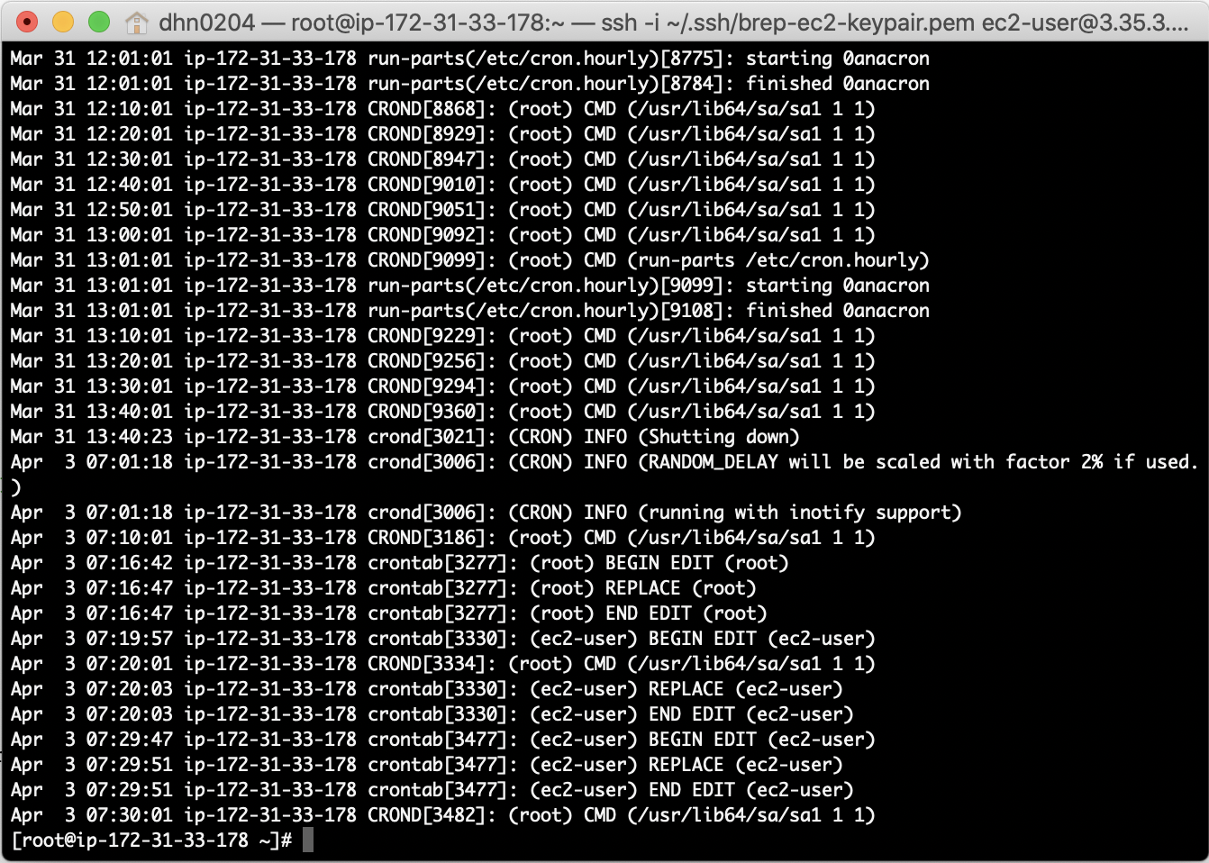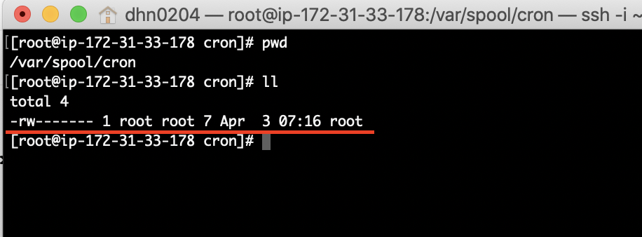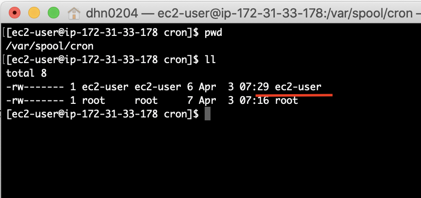 ec2-user 계정으로 crontab 을 생성한 경우 /var/spool/cron/ec2-user 파일이 생성됩니다.