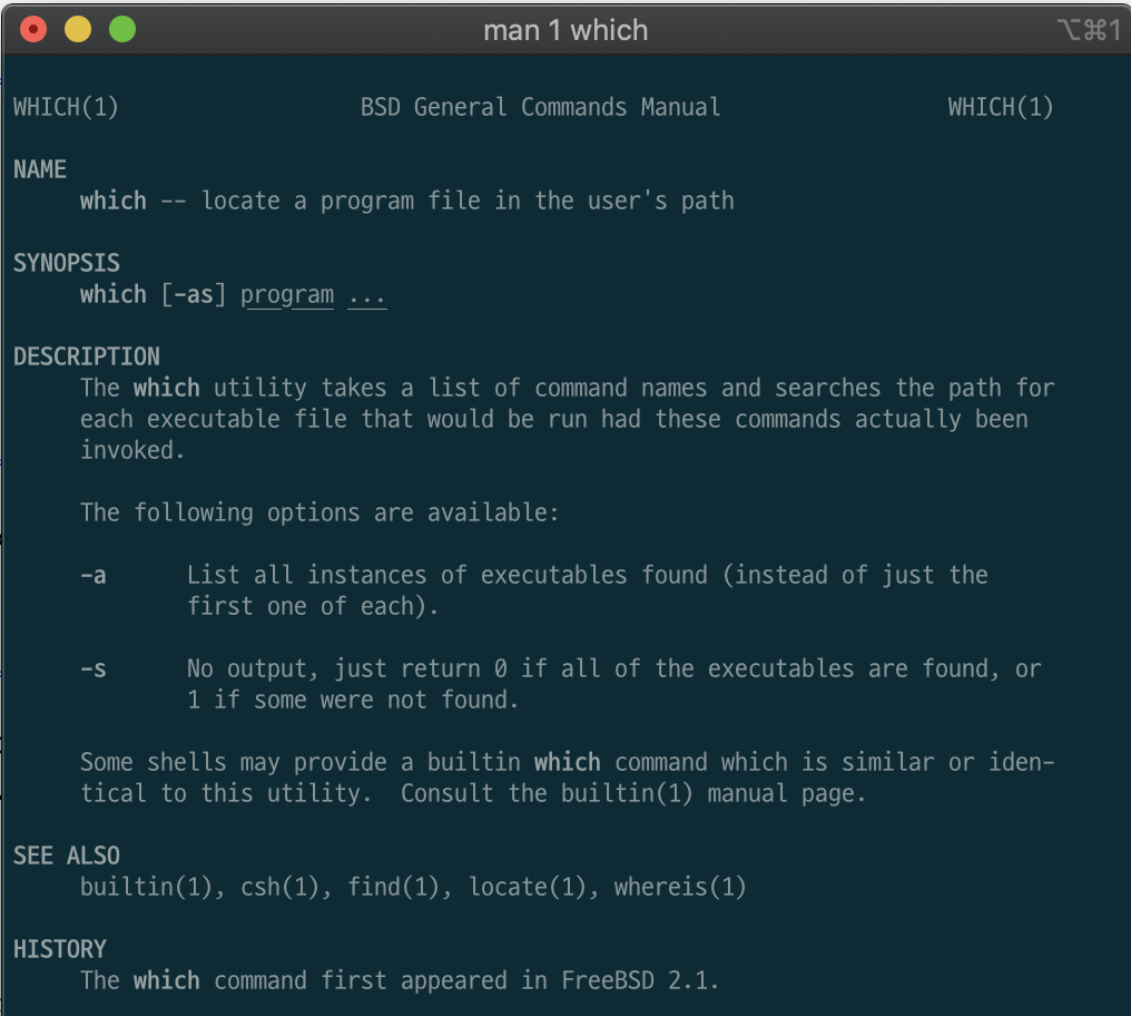 which commands의 위치는 section1 (user commands) 이므로 다음과 같은 명령어를 입력해 manual을 open 할 수 있습니다. 만약 section number가 1일 경우엔 1을 생략할 수 있습니다.