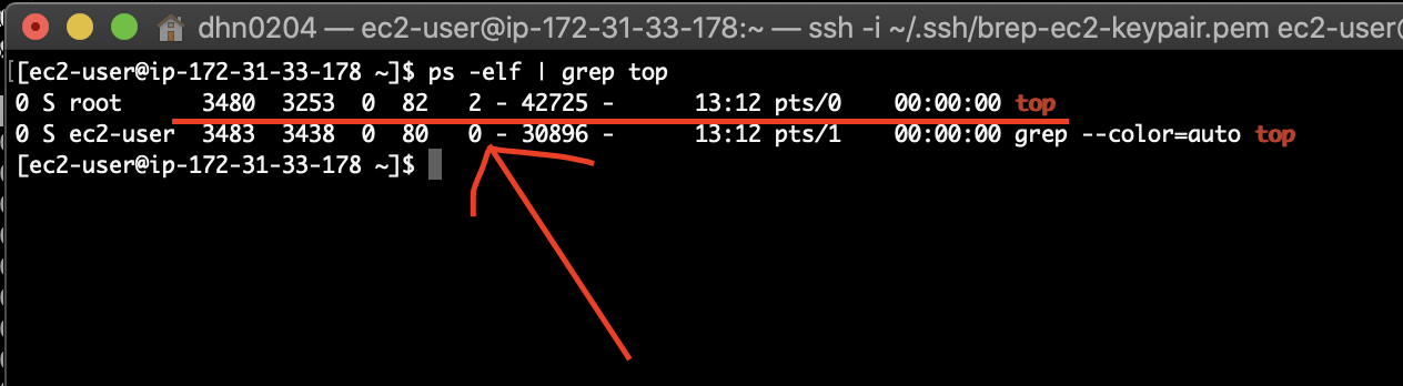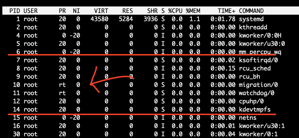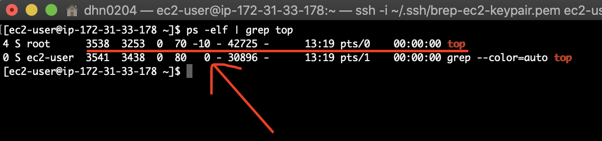 결과 값으로 각 process 별 PRI(우선순위) 와 NI(Niceness) 값을 확인할 수 있습니다.