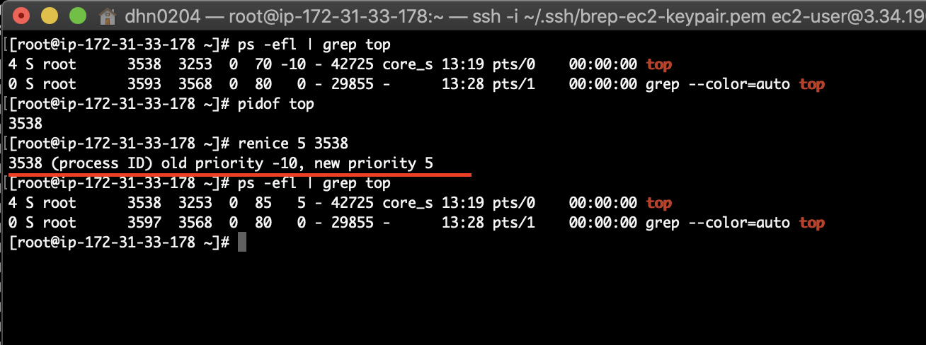 동작중인 top process 의 nicenss 값을 변경하기 위해선 renice 명령어를 사용합니다.