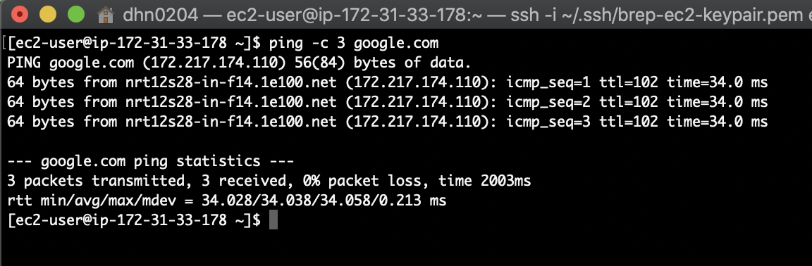 ping 명령어를 사용해 network 상태가 확인되었다면, 더이상 packet 을 보내지 않기위해 ctrl+C 를 입력합니다.