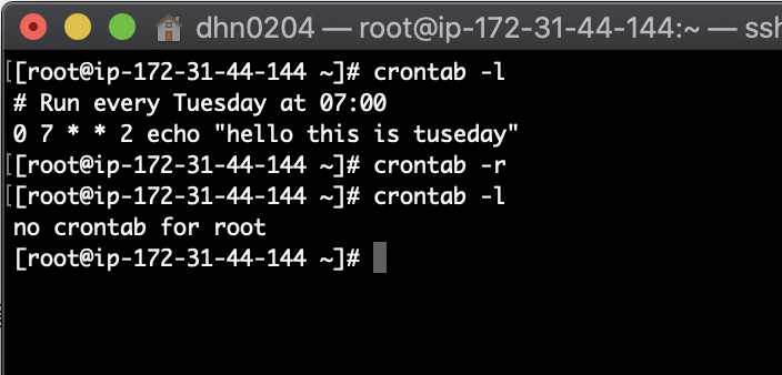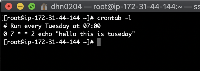 0 7 * * 2 echo "hello this is tuesday" 매주 수요일 새벽 07:00 마다 echo "hello this is tuesday" 라는 명령어가 실행되게 됩니다.