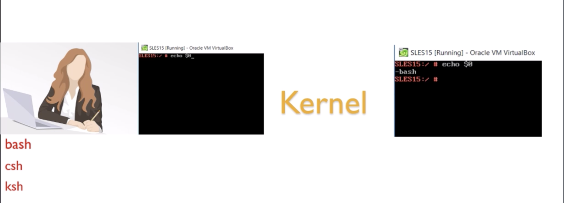 kernel은 shell 에게 전달받은 명령을 성공적으로 수행하기위해 시스템의 hardware & software components를 활용합니다.