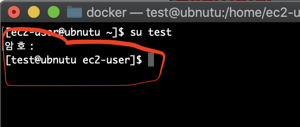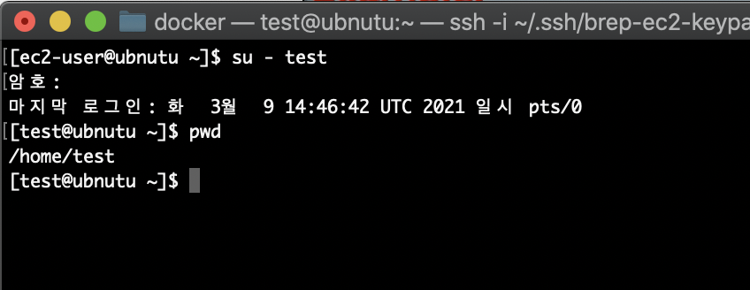 su - test현재의 path 를 출력해주는 pwd 명령어를 입력하면 다음과 같이 test 의 home directory 로 이동한 것을 확인할 수 있습니다.