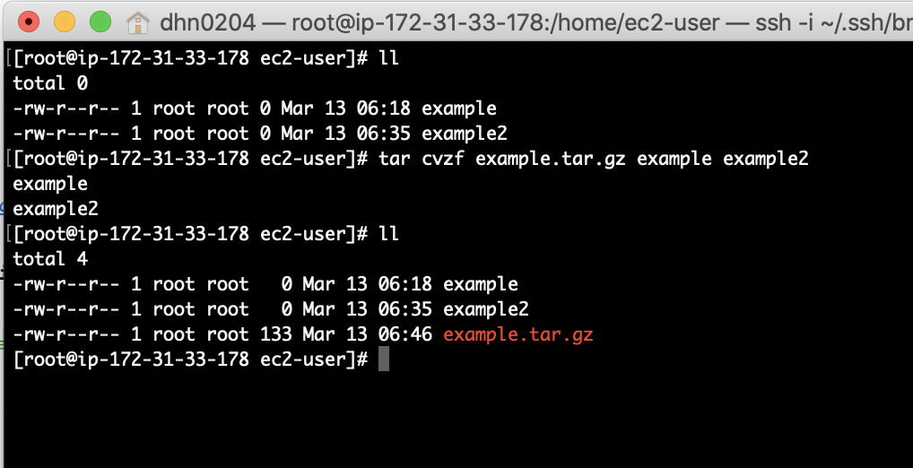 예를 들어 example & example2 파일을 example.tar 로 묶고 싶은 경우 다음과 같이 입력합니다.