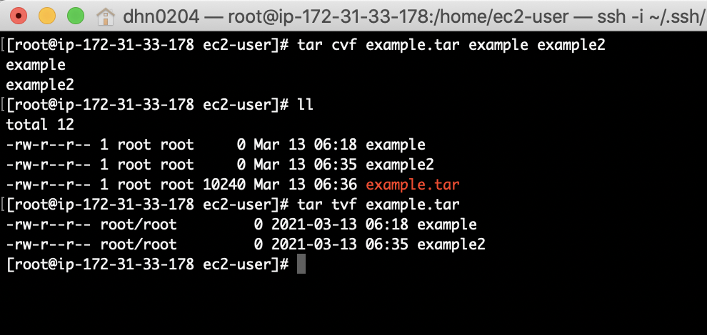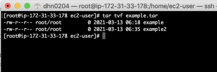 tar cvf exmaple.tar example example2결과는 다음과 같습니다.