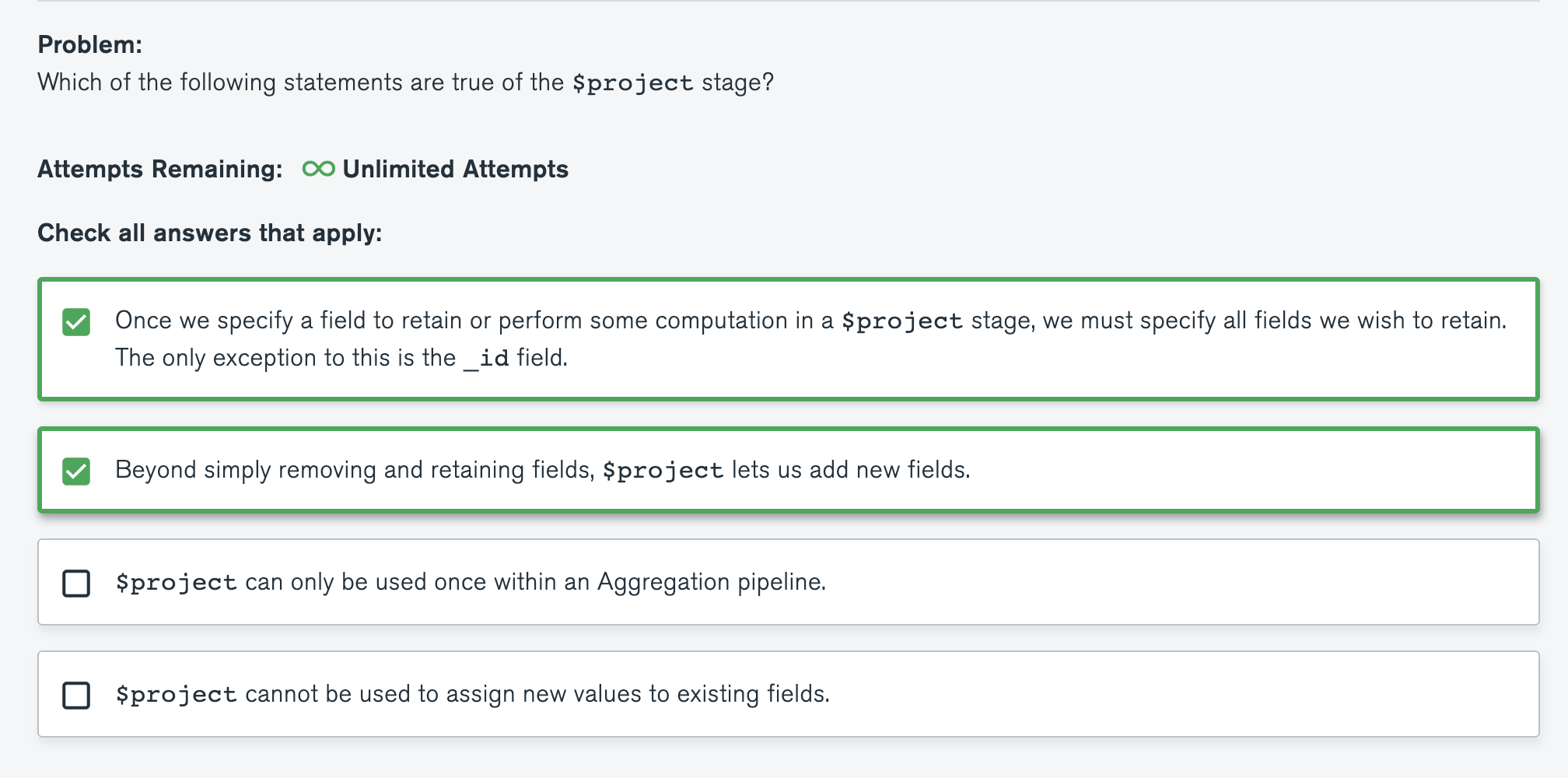 Quiz : Which of the following statements are true of the $project stage?